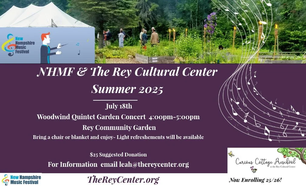 Woodwind Quintet Garden Concert Friday, July 18, 2025 4:00 PM 5:00 PM Google Calendar ICS Woodwind Quintet Garden ConcertThe Rey Cultural Center & New Hampshire Music Festival present the Woodwind Quintet Garden Concert! This event is free of charge, with a suggested donation of $25, and will take place at The Rey Center Community Garden. Learn more